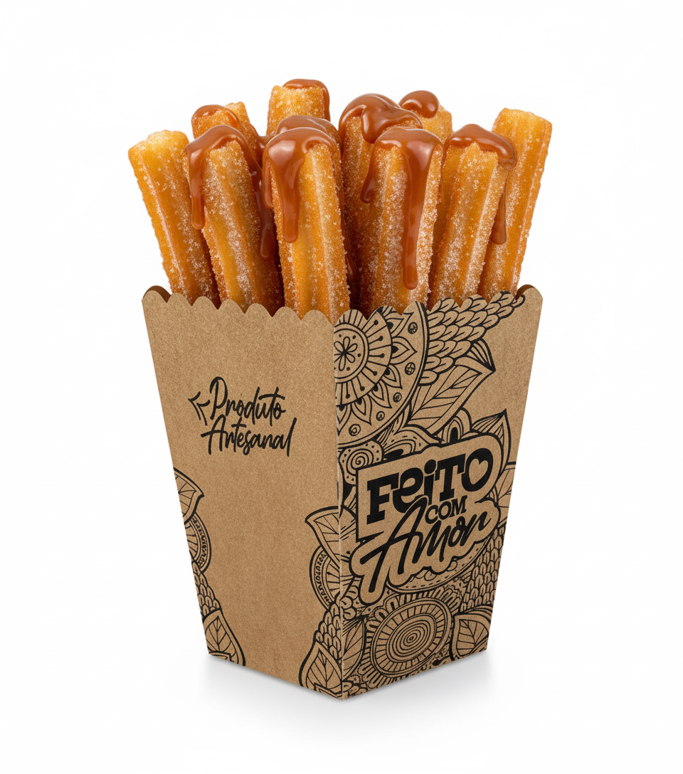 Fabricada em papel Kraft 240g, um material espesso e de alta rigidez, esta caixa é perfeita para acomodar grandes volumes de pipoca, batatas fritas, salgados e doces sem perder a forma. A estampa "Feito com Amor" e a lateral "Produto Artesanal" reforçam a qualidade e o cuidado do seu preparo. Com base de 8,5cm, altura de 22,5cm e uma boca larga de 11,5cm, facilita o consumo direto na embalagem.