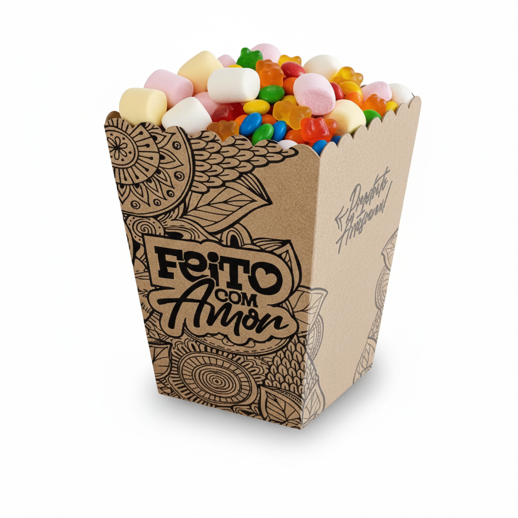 Transforme qualquer momento em uma ocasião especial com a Caixa para Pipoca e Snacks tamanho P da linha "Feito com Amor"! Com seu design charmoso e formato prático, ela é perfeita para servir pipoca, docinhos, pequenos salgados e outros petiscos com um toque de carinho.